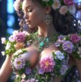 тело красивой девушки полностью состоящее из цветов, шикарные волосы, драгоценные украшения, нагота, эстетика женского тела, кружевное белье из цветов, профессиональное фото, красиво, реалистично, 4k, высокое разрешение, 30mm lens, massive cleavage, эстетично, ISO 100, высокая детализация, крупным планом, мягкое освещение , dark botanical, большой открытый бюст, пышные формы, boob, декольте